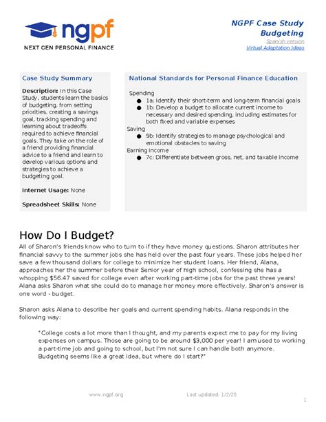 The ngpf case study budgeting answer key is designed to help individuals create a budget and manage their finances effectively. This tool provides step-by-step instructions on how to create a budget, track expenses, and save money. With the ngpf case study budgeting answer key, you can take control of your finances and achieve your financial goals.